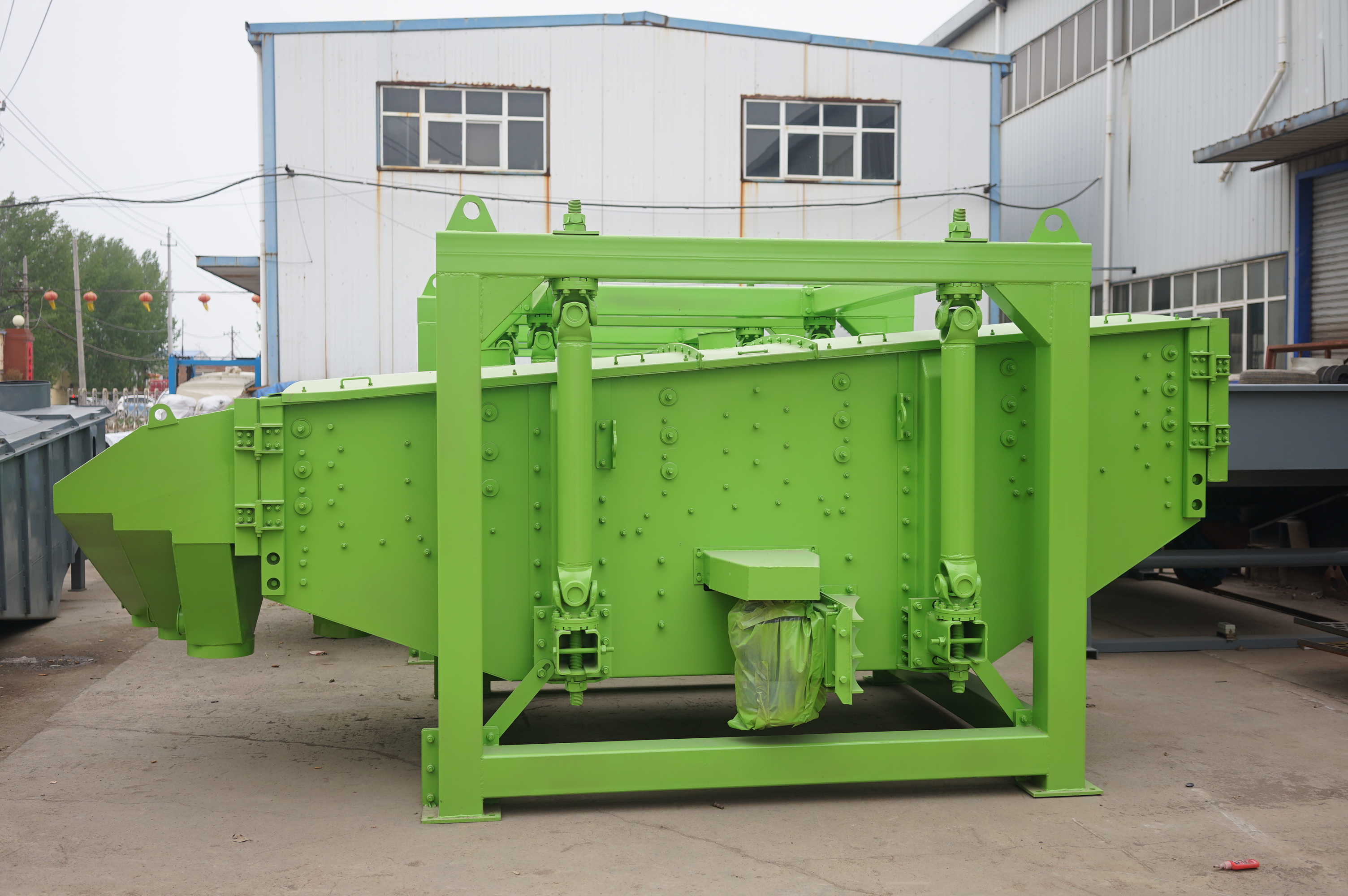 直線振動篩因為其結構簡單,耐用,篩分效果突出,已經廣泛應用在了食品,化工,礦業,冶金,建筑等各個行業。直線振動篩其振動軌跡是一復雜的空間曲線。該曲線在水平面投影為一圓形,而在垂直面上的投影為一橢圓形。調節上、下旋轉重錘的激振力,可以改變振幅。而調節上、下重錘的空間相位角,則可以改變篩面運動軌跡的曲線形狀并改變篩面上物料的運動軌跡。振動篩利用振子激振所產生的往復旋型振動而工作的。振子的上旋轉重錘使篩面產生平面回旋振動,而下旋轉重錘則使篩面產生錐面回轉振動,其聯合作用的效果則使篩面產生復旋型振動。
